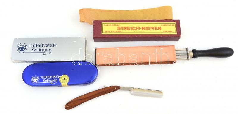 Leírás: Solingen borotva fa nyéllel, eredeti fém tokban, szép állapotban, h: 23,5 cm + bőr borotva fenő, h: 33,5 cm