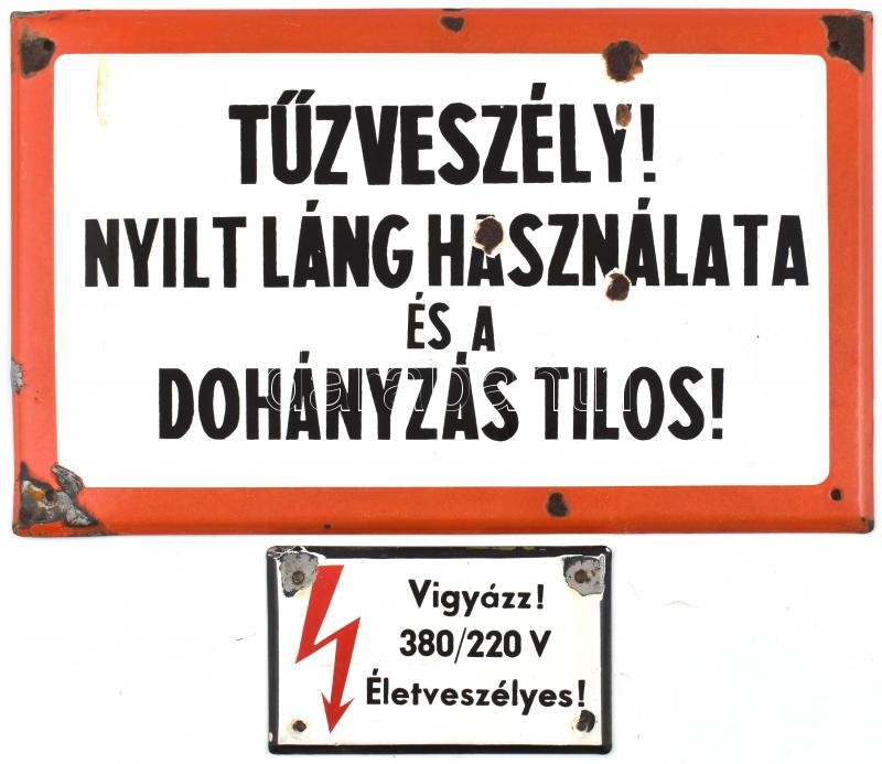 Leírás: Tűzveszély + Vigyázz! 380/220 V Életveszélyes! Zománc táblák, sérülésekkel, 24,5x39,5 cm, 10x16 cm