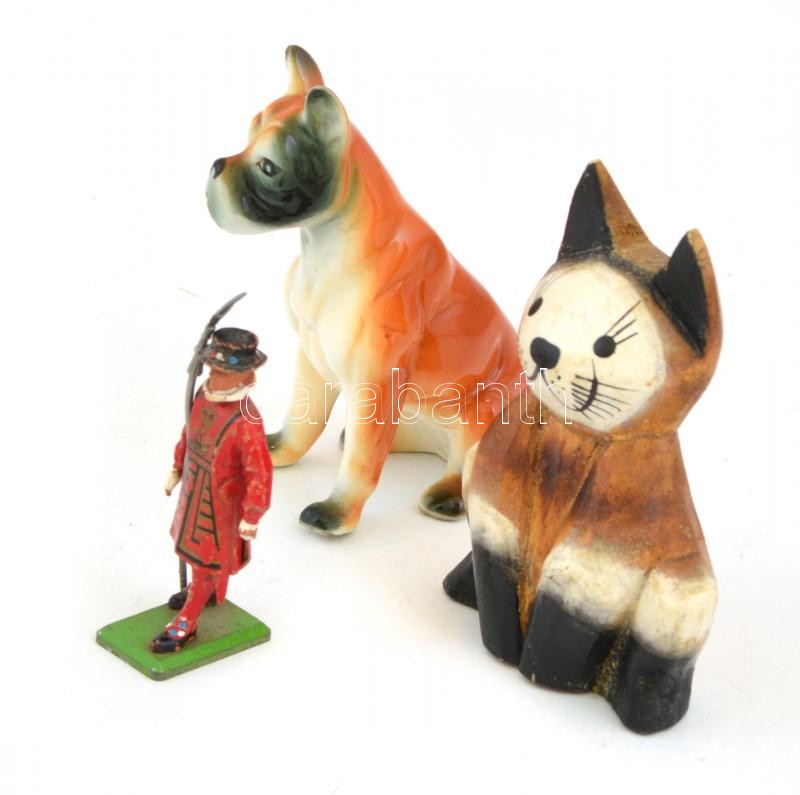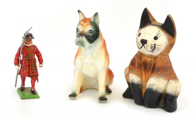 Leírás: Vegyes bolha tétel: ólomkatona, m: 7 cm + fa, festett macska, 8,5x6,5 cm + jelzetlen, kézzel festett porcelán kutya, 8,5x7 cm