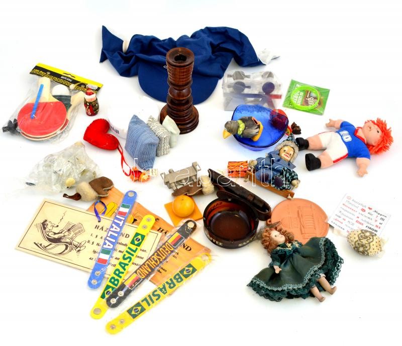 Leírás: Vegyes bolha tétel: üveg hamutál, Butler's mini asztalitenisz ütő és labda szet, réz levélbontó kés, bohóc figura hintán, kék üveg tálka stb.