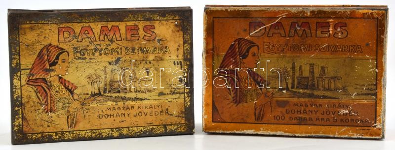 cca 1910 2 db Dames egyptomi szivarka fém doboz fedéllel, illusztrált, címeres, egyik belsejében további illusztrációval papíron. Kopott, 9x12,5x4,5 cm