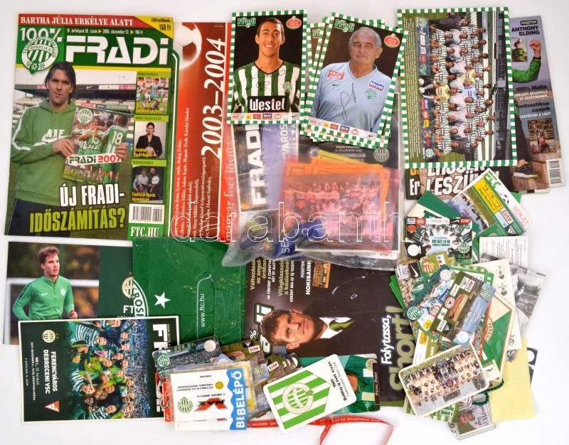 cca 1971-2014 Ferencváros és futball emléktárgyak: sok-sok bérlet, több kártyanaptár, jegy az FTC-Ajax 1995-ben rendezett BL mérkőzésre és későbbi nemzetközi találkozókra, Szőke István labdarúgó (1947-) dedikált és dátumozott fényképe (1973.X.31), 100% Fradi 2010-es évfolyamának több száma, VIII. évf, 3. szám, 2014 stadionátadó nyitómérkőzés FTC-Chelsea műsörfüzet, kisméretű zászló cca 1976, belépők magyar válogatott mérkőzésekre, többek közt a 2004-es Brazília ellenire, stb.