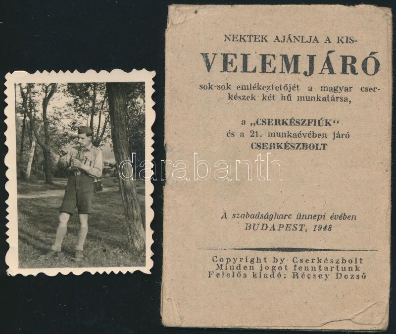 Leírás: Velemjáró cserkésznaptár, 1948, sok ábrával és magyarázattal, sérült papírkötésben + cserkész egenruhában és fényképezőgéppel, vintage fotó, 6x4,5 cm