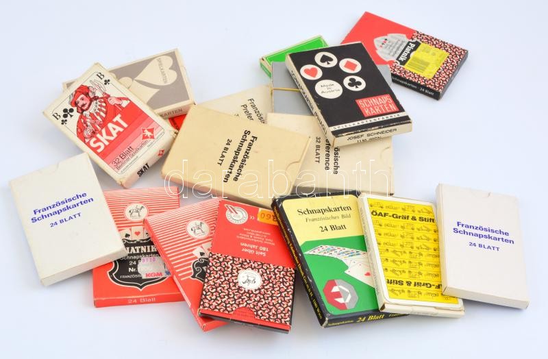 Leírás: Vegyes kártya tétel, összesen 16 db pakli, közte 4 db 32 lapos franciakártya pakli(Skat, Preference), 12 db 24 lapos snapszer kártyapakli.