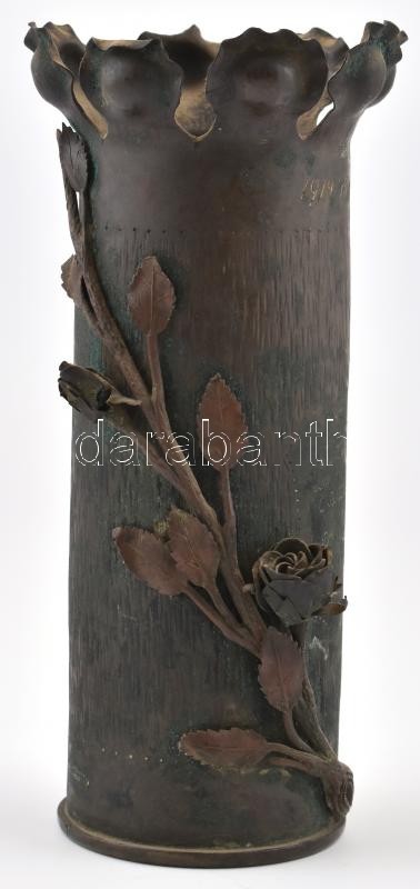 Leírás: Lőszerhüvelyből készült váza 1914-15-16 Nagy Háborúból emlék Teruskának. felirattal. 25 cm