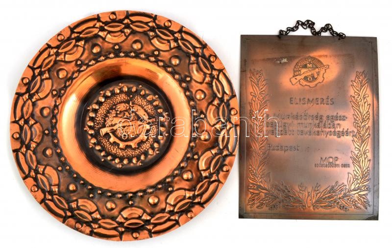 Leírás: Munkásőrség elismerés plakett, fém, falra akasztható, 22x16 cm + Munkásőr réz fali tányér, d: 28 cm