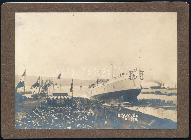 cca 1910 Az SMS Zrínyi, az Osztrák-Magyar Monarchia csatahajójának vízre bocsátása, keményhátú fotó, 11x15,5 cm / SMS Zrínyi, battleship of the Austro-Hungarian monarchy, setting afloat, photo
