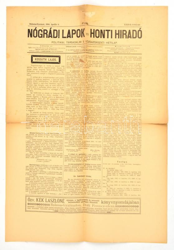 1894. április 8., Nógrádi Lapok és Honti Híradó, politikai, társadalmi s közgazdászati hetilap, XXII. évfolyamának 15. száma, írássokkal Kossuth Lajos temetéséről és Gr. Széchenyi Istvánról, sérült, szakadt