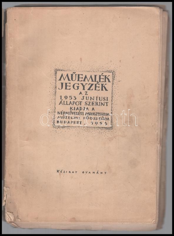 1953 Műemlék jegyzék az 1953 júniusi állapot szerint. Stencilezett kéz... https://www.darabanth.com/hu/375-Gyorsarveres/375.0/Mutargy-papirregiseg-egyeb/Nyomtatvanyok~500032/1953-Muemlek-jegyzek-az-1953-juniusi-allapot-szerint-Stencilezett-kezirat-225p-Csak-450-pld~II2195104