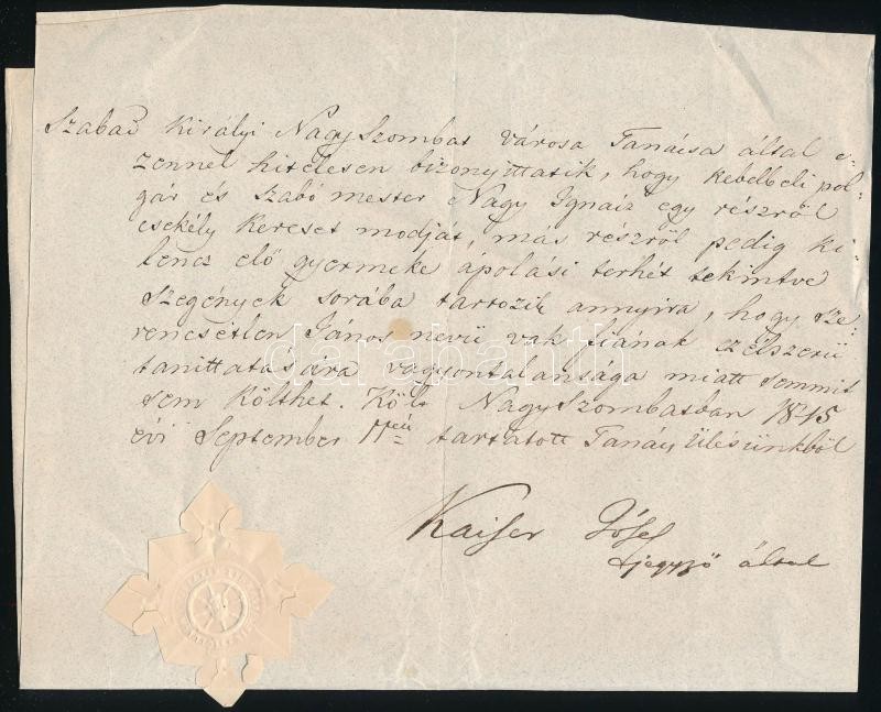 Leírás: 1845 Nagyszombat, Szabad Királyi Város Tanácsa által kiállított szegénységi igazolás, szárazpecséttel