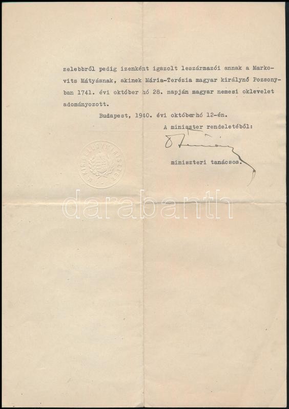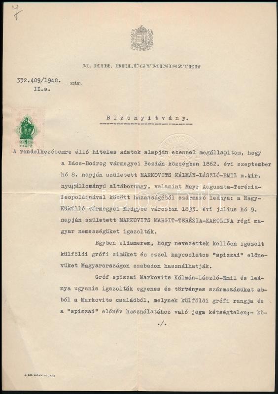 1940 Régi magyar nemességet igazoló m. kir. belügyminisztériumi bizonyítvány, gróf Markovits Kálmán László Emil altábornagy (1862-1945) és leánya számára kiállítva, szárazpecséttel, okmánybélyeggel,