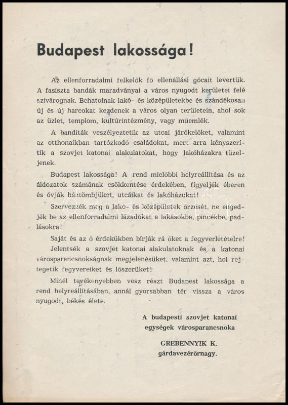 Leírás: 1956 A budapesti szovjet katonai egységek városparancsnoka által Budapest lakosságához intézett röplap