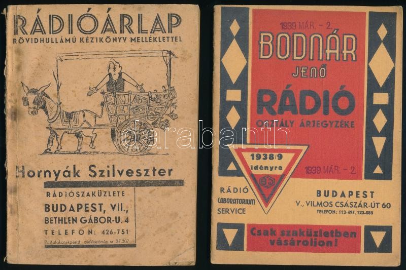 Rádióárlap rövidhullámú kézikönyv melléklettel, Hornyák Szilveszter rádiószaküzlete. Bp., é.n. (1940 körül), Hornyák Szilveszter, 152p. Foltos papÃrkötésben + Bodnár JenÅ‘ rádió osztály árjegyzéke 1938/9 idényre, Bp.. PapÃrkötés, jó állapotban.