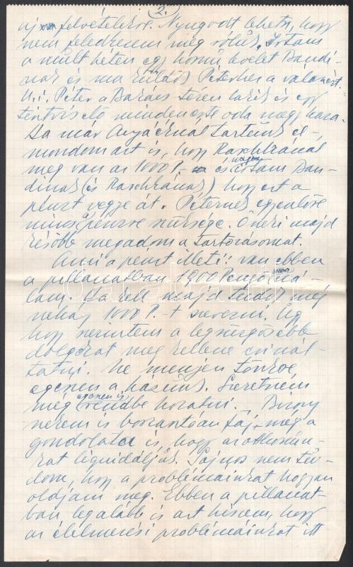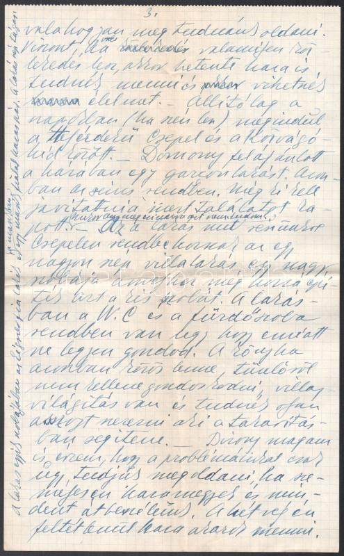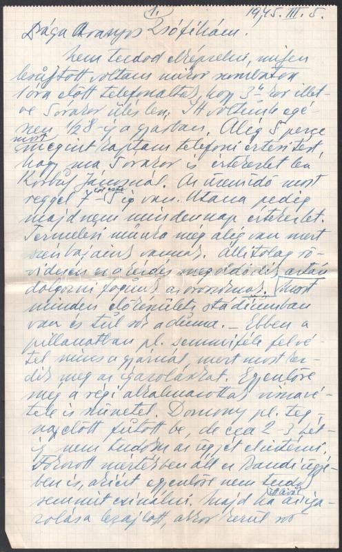 1945.III.5 Csepel-Budapest, Geleji Sándor (1898-1967), a Weiss Manfréd Acél- és Fémművek igazgatója részben személyes hangú levele feleségének. A gyárban, azaz a Weiss-Manfréd-Művekben sok a munka és rengeteg tárgyalása van: "Az üzemidő (...) 7-től este 5-ig van. Utána pedig majdnem minden nap értekezlet. Termelés még alig van (...), aztán dolgozni fogunk az oroszoknak." Kiemeli, hogy hiány van személyzetből: "Ebben a pillanatban pl. semmiféle felvétel nincs a gyárnál, mert most kezdik meg az igazolásokat". Leírja a budapesti ostrom utáni helyzetet, ellátási és közlekedési nehézségeket. "Állítólag a napokban megindul a Helyiérdekű Csepel és Közvágóhíd között" (....) Állítólag a Ferenc-József híd is hamarosan járható lesz. Gőzerővel építik az összekötő hidat, lesz egy cölöphíd a Margit-hídnál is." Ír a közbiztonságról is: "A közbiztonság sajnos Csepelen sem a legprímább. Itt a W.M. igazolványt még csak respektálják (...) Úgy látszik ez a háború! (?)". Valamint azt is közli, hogy ugyanannyi fizetést kap, mint egy művezető, de még nincsenek rendezve, más egyéb érdekes részlettel. Hét és fél kézzel írt oldal, érdekes kordokumentum, közvetlen Budapest II. világháborús ostroma után!