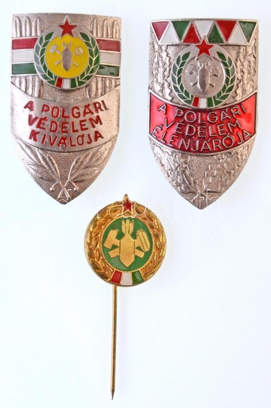 Leírás: ~1980. "A Polgári Védelem Kiválója" ezüstözött zománcozott fém jelvény miniatűrrel + "A Polgári Védelem Élenjárója" ezüstözött zománcozott fém jelvény (22x40mm) T:2