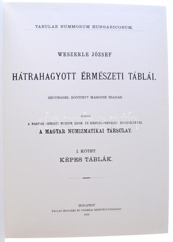 Weszerle József hátrahagyott érmészeti táblái - Szöveggel bÅ‘vÃtett második kiadás. Kiadja a Magyar Numizmatikai Társulat. I. kötet - Képes Táblák. A Pallas Irodalmi és Nyomdai Részvénytársaság 1911. évi kiadásának reprint kiadása, újszerű állapotban.