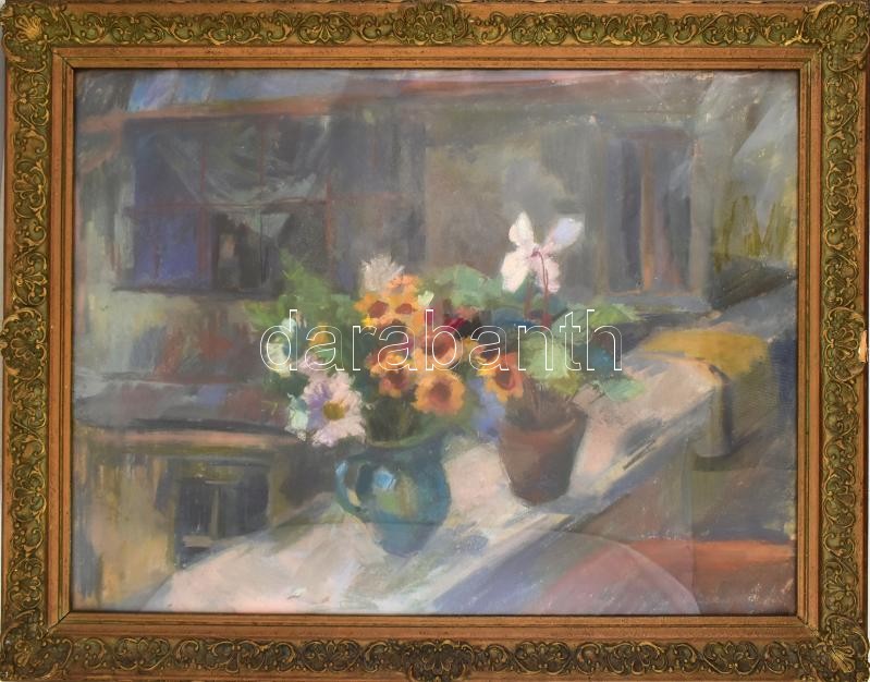 Szilvássy Pál (1920-1996): Virágcsendélet. Vegyes technika, papír. Jelzett és datátl (Szilvássy 57). Kissé sérült, díszes üvegezett fa keretben, 60×80 cm