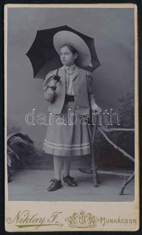 Leírás: cca 1910 Fiatal lány műtermi portréja, keményhátú fotó Niklay munkácsi műterméből, 10,5×6 cm