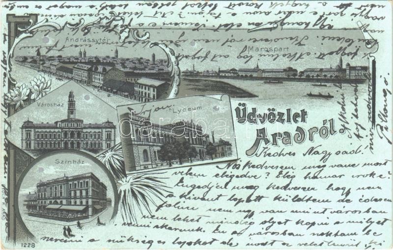 1904 Arad, Andrássy tér, Maros-part, Városháza, Lyceum, Színház. Bloch H. kiadása / square, Mures riverbank, town hall, high school, theatre. Art Nouveau, floral, metallic litho (EB)