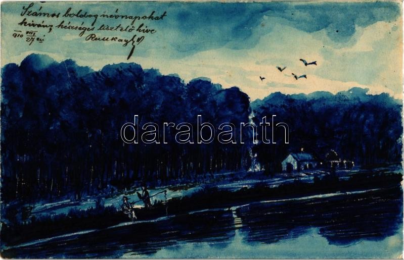 Leírás: 1910 Pécska, Petschka, Pecica; folyópart horgászokkal. Kézzel festett művészlap / riverside with fishermen. Hand-painted art postcard (EK)