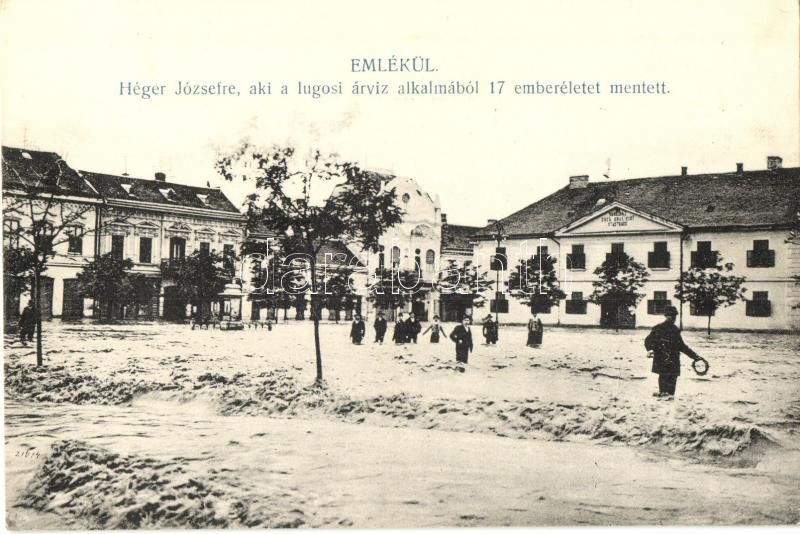 1912 Lugos, Lugoj; Emlékül Héger Józsefre, aki a lugosi árvíz alkalmából 17 emberéletet mentett. Kiadja Auspitz Adolf / to remember József Héger, who saved 17 lives during the flood in Lugoj