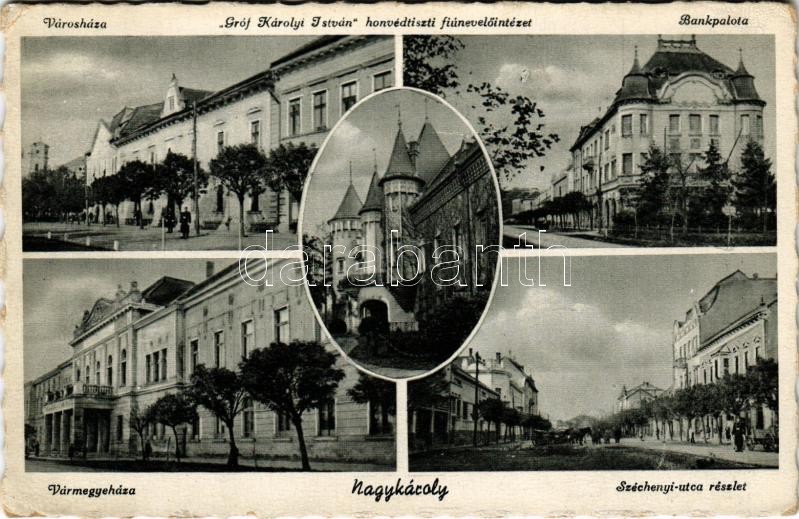 1942 Nagykároly, Carei; Városháza, "Gróf Károlyi István" honvédtiszti fiúnevelőintézet (Károlyi kastély), Bankpalota, Vármegyeháza, Széchenyi utca / town hall, Hungarian military school (castle), bank palace, county hall, street view (EK)