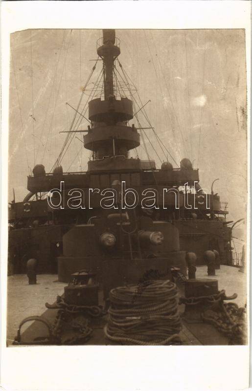 Leírás: SMS Babenberg az Osztrák-Magyar Haditengerészet Habsburg-osztályú pre-dreadnought csatahajója (Linienschiff), fedélzet. fotó kartonlapra ragasztva / WWI Austro-Hungarian Navy, K.u.K. Kriegsmarine, SMS Babenberg pre-dreadnought battleship, deck. photo glued to paper (non PC) (vágott / cut)