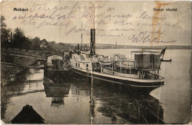 Leírás: 1915 Mohács, Dunai részlet, gőzhajó. Pollák Róbert kiadása (fa)