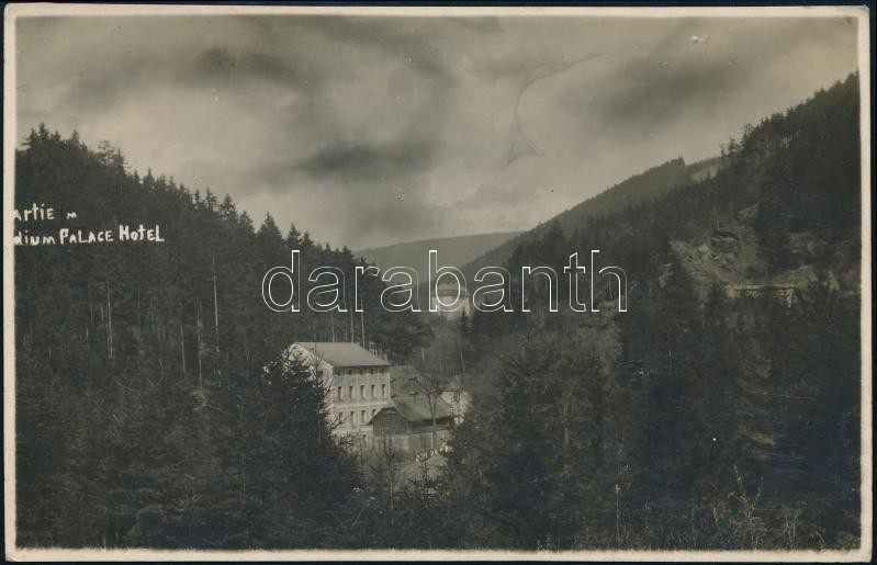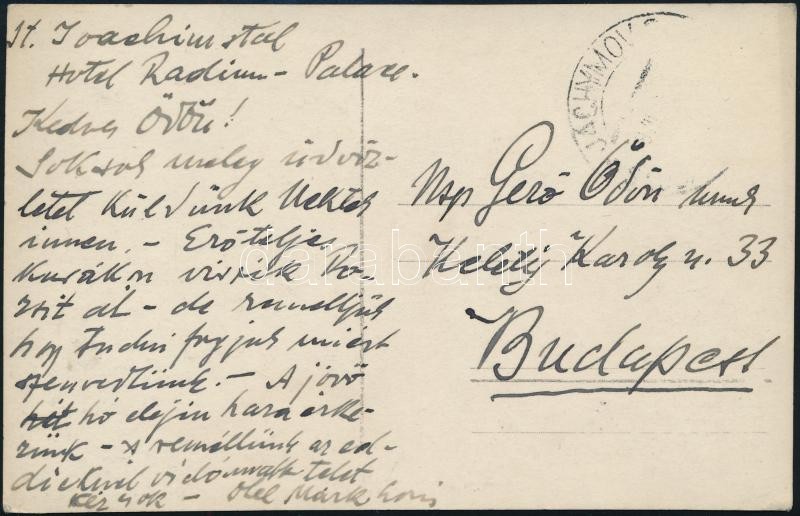 Márk Lajos (1867-1942) festőművész autográf üdvözlő képeslapja Gerő Ödön (1863-1939) újságírónak küldve, a Joachmsthali Hotel Radium Palace szállodát ábrázoló képeslapon.