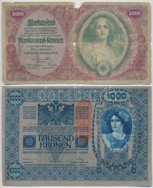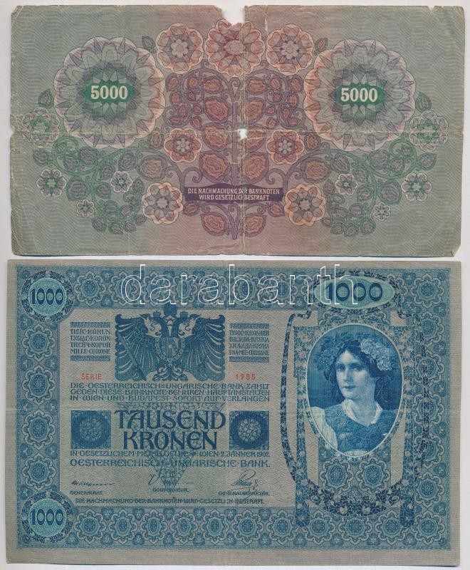 Austria 1922. 5000 Kronen C:G hole, tears + 1902. 1000 Kronen with red "Deutschösterreich" overprint C:F
