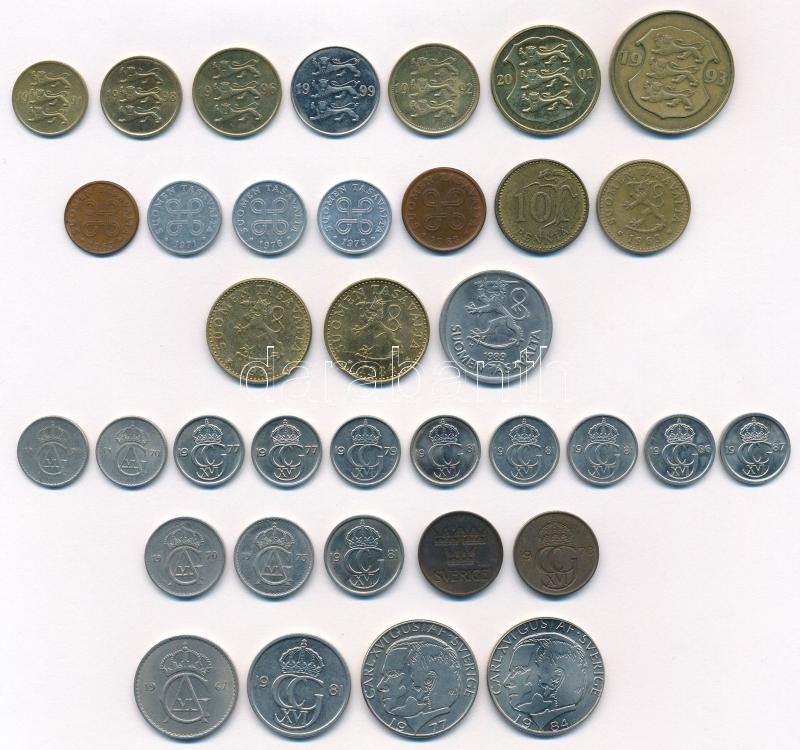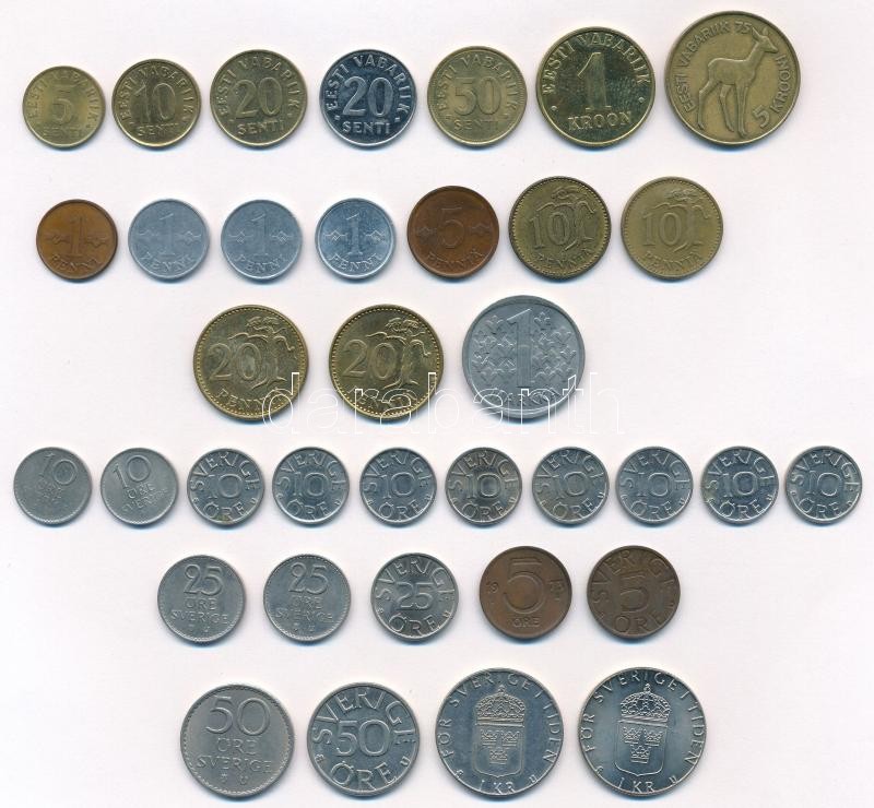 Mix: Estonia 1991-2001. 5 Senti - 5 Krooni (7xdiff) + Finland 1963-1989. 1 Penni - 1 Markka (10x) + Sweden 1967-1986. 5 Ore - 1 Krona (19x) C:AU,XF