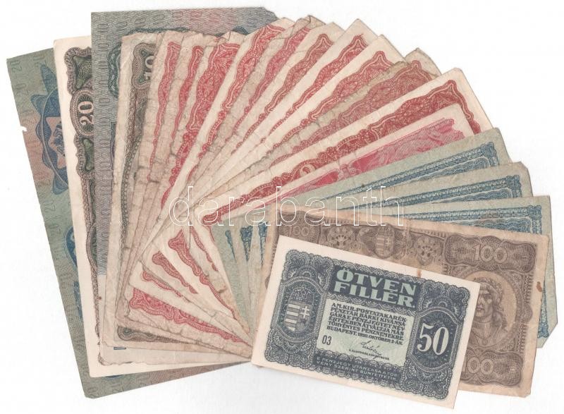 Leírás: 1920. 50f + 1913. 20K + 1915. 10K + 1916. 1K + 1920. 1K (3x) + 2K "aa" (5x) + 2K "ab" (5x) + 10K + 20K + 1923. 100K T:III,III-