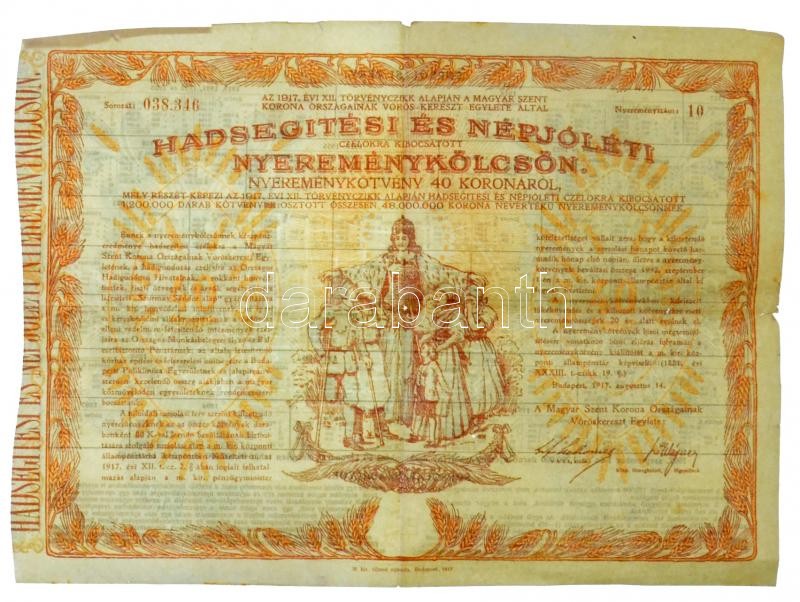 Budapest 1917. "Hadsegítési és Népjóléti nyereménykölcsön" nyereménykötvény 40K-ról T:III,III-