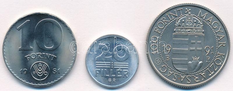 Leírás: 1981. 10Ft Ni "FAO" + 1983. 20f Al "FAO" + 1991. 100Ft Cu-Ni "II. János Pál pápa látogatása" T:1