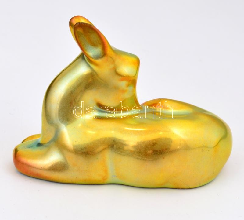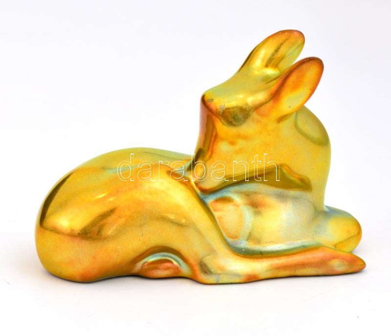Leírás: Zsolnay eozin mázas őzike, jelzett, apró mázhibával, m: 6,5 cm, h:9 cm