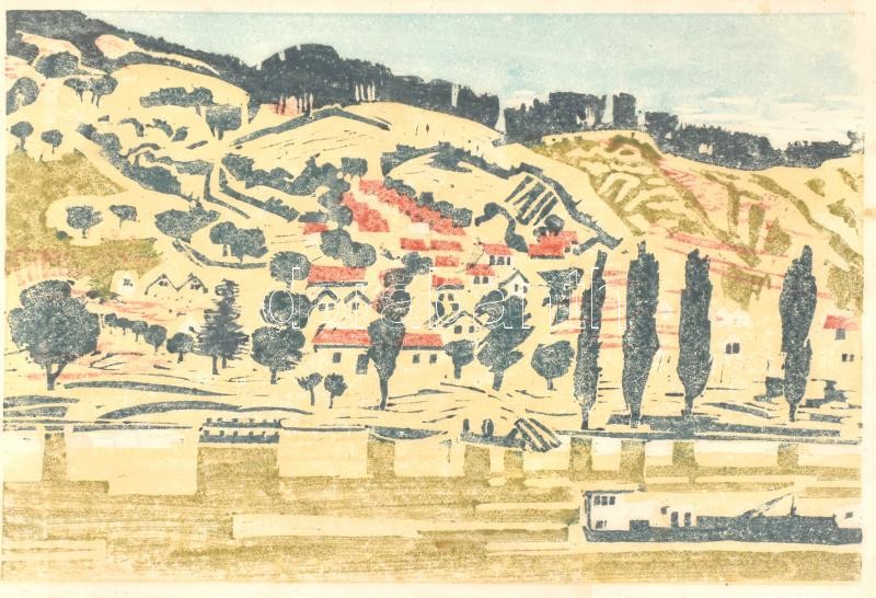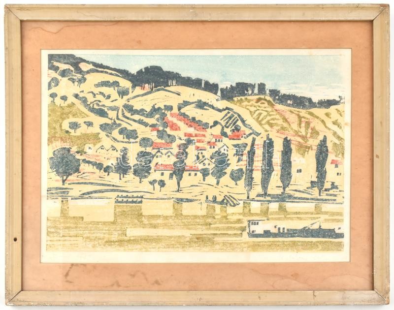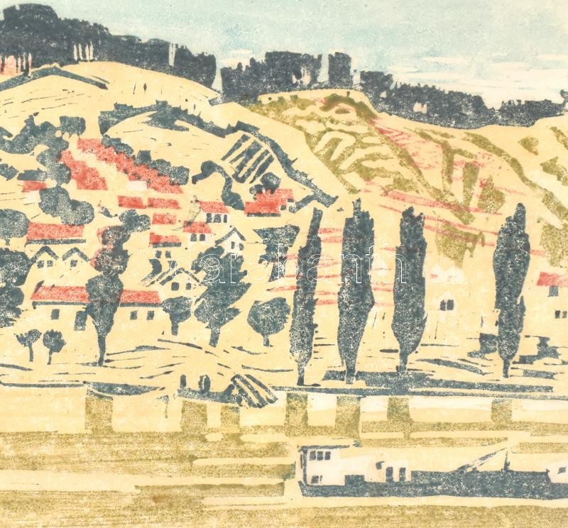 Leírás: B. Séday Mária (1925-2009): Dunai táj. Színes linómetszet, papír, jelzett, lap alja kissé foltos, üvegezett keretben, 30,5×43 cm