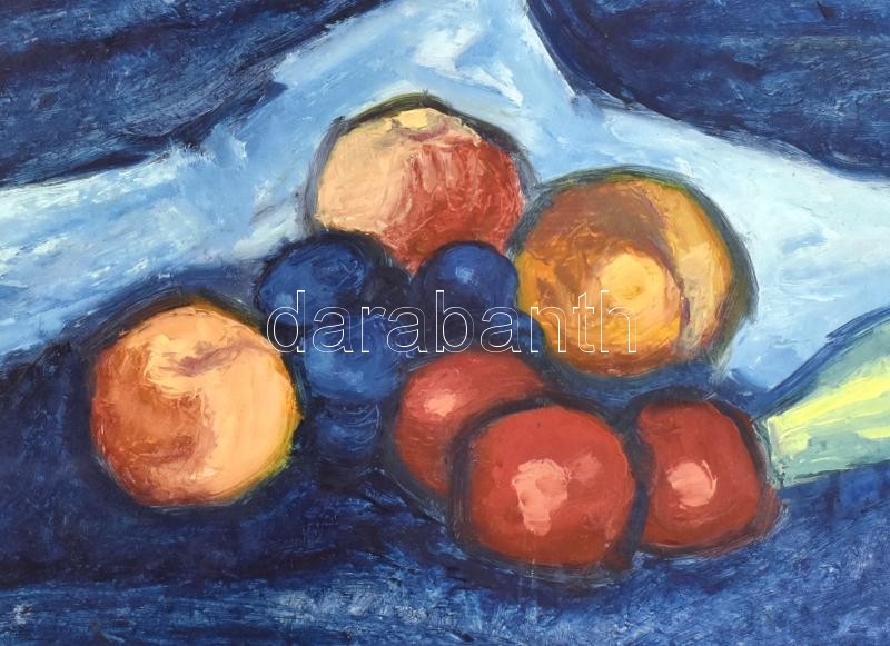 Leírás: Egyeki Aladár (?-): Csendélet kékben. Olaj, farost, fa keretben, 37×49,5 cm
