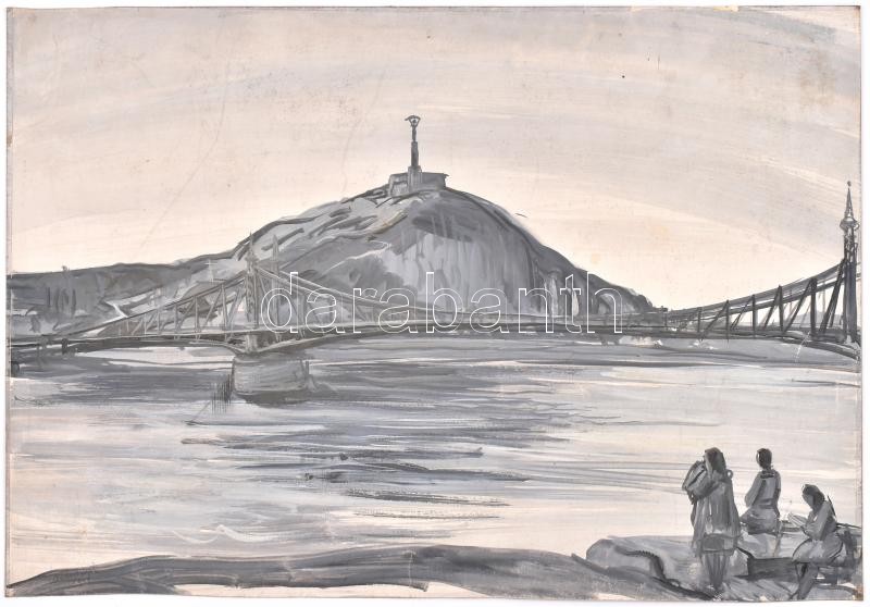 Leírás: Élesdy István (1912-1987): Dunánál, háttérben a Szabadság-szobor. Vegyes technika, papír, jelzés nélkül. 29×42 cm