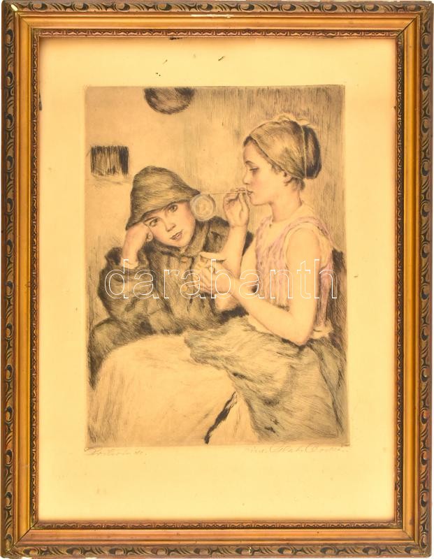 Glatz Oszkár(1872-1958)-Prihoda István(1891-1956): Buborékfújók. Színezett rézkarc, papír, jelzett. Lap teteje és széle sérült. Kissé sérült fa keretben, 29×21,5 cm