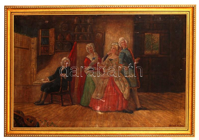 Leírás: Heinrich jelzéssel: Társaság. Olaj, vászon, kissé sérült, keretben, 60×92 cm