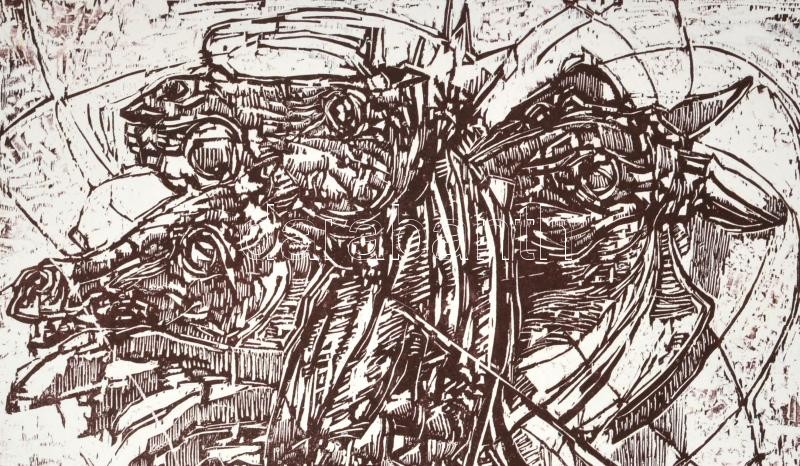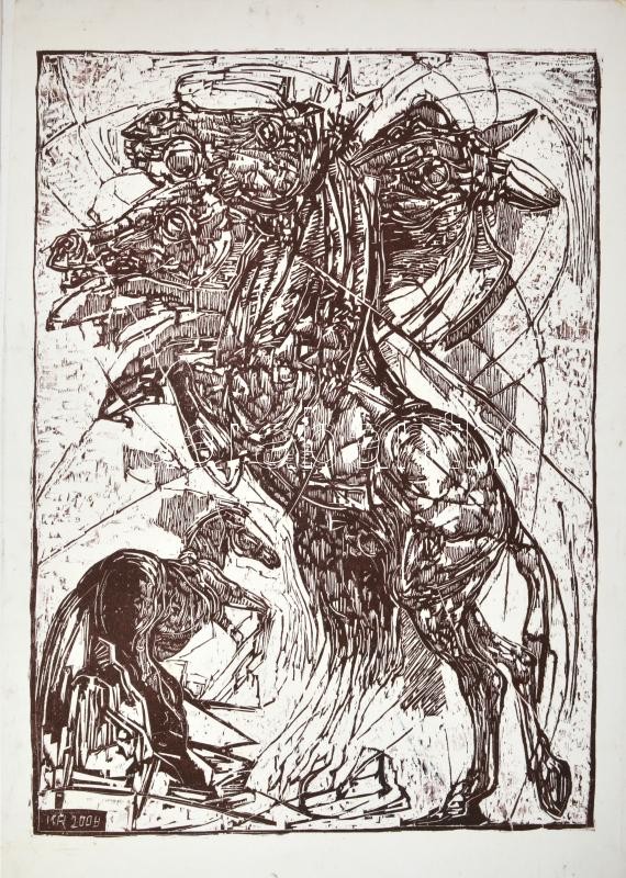 König Róbert (1951-2014): Hyppomágia II (Paripák). Fametszet, rizspapír, farostra kasírozva, jelzett a nyomaton (KR 2008). Kisebb sérüléssel a lap tetején, fametszet ép. Kőnig Róbert grafikus munkásságának meghatározó témája volt a ló, lovassport, ló és ember kapcsolata. Az aukciónkon szereplő, nem csak méretében kiemelkedő művének egyik előképe Franz Marc (1880-1916) német festő Der Turm der Blauen Pferde c. festménye is lehetett. A Hyppomágia II egy másik példánya a 2008-ban, az 55. Vásárhelyi Őszi Tárlaton és a Képzőművészeti Egyetem Mecénások Dicsérete c. kiállításán 2019.12.04-2020.01.24-ig volt látható. Utóbbi tárlaton egy különteremben kizárólag König Róbert munkái kerültek kiállításra. 100×69,5 cm / Róbert König (1951-2014): Hyppomágia II (Horses). Woodcut, rice-paper, on board, signed on the woodcut (KR 2008). With a small damage on the top, the woodcut is without damage. Róbert König was famous for depicting horses and Hyppomágia II is among his best works. Another piece of this woodcut was exhibited twice, in 2008 and 2019/2020. 100×69,5 cm.