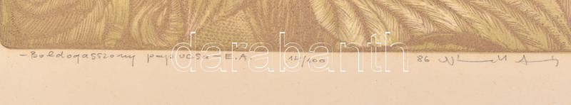 Leírás: Németh András (1941-): Boldogasszony papucsa. Színes linómetszet, papír, jelzett, művészpéldány E.A., számozott (14/100), üvegezett keretben, 38x20,5 cm
