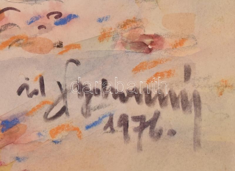 Leírás: Olvashatatlan jelzéssel: Buksi a pesti Dunaparton. Vegyes technika, papír, lap szélén ragasztás maradványai, 43×30 cm