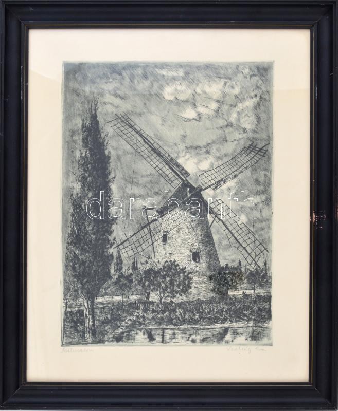 Leírás: Scultéty Éva (1917-2001): Szélmalom, rézkarc, papír, jelzett, üvegezett fa keretben, 39x28,5 cm.