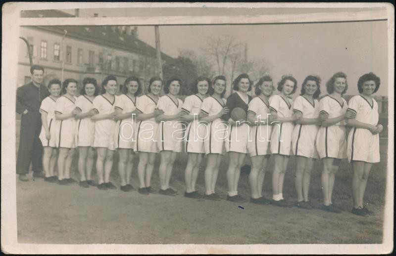 1941 Kézilabdázó lányok csapata, fotólap, 9×13,5 cm https://www.darabanth.com/hu/377-Gyorsarveres/377.0/Fotomuveszet/Foto~21/1941-Kezilabdazo-lanyok-csapata-fotolap-9C39713-5-cm~II2219993