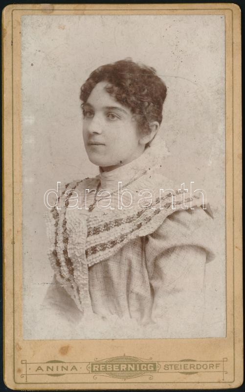 cca 1900 Női portré, keményhátú fotó Louis Rebernigg műterméből, 10,5×... https://www.darabanth.com/hu/377-Gyorsarveres/377.0/Fotomuveszet/Foto~21/cca-1900-Noi-portre-kemenyhatu-foto-Louis-Rebernigg-mutermebol-10-5C3976-5-cm~II2220603