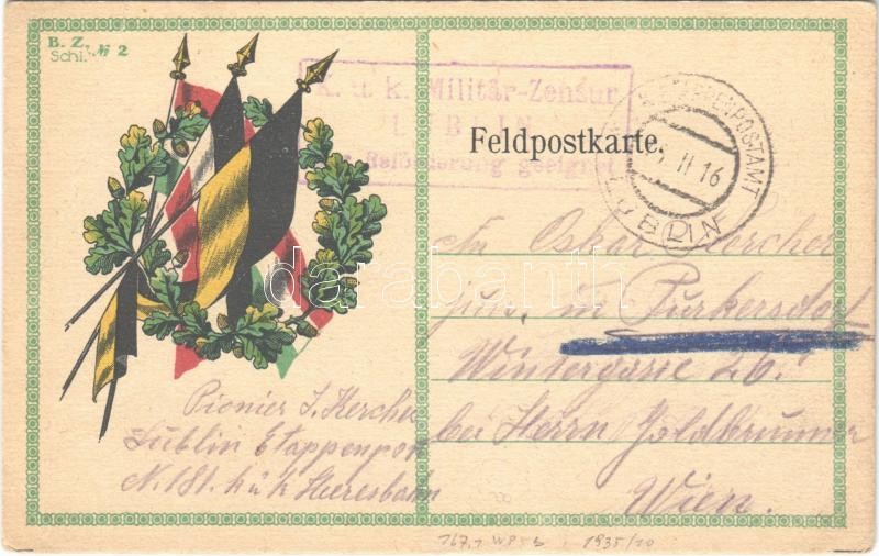 Leírás: 1916 WWI Austro-Hungarian K.u.K. military field postcard, Viribus Unitis propaganda, Hungarian, German and Austrian flags. B. Z. Schl. No. 2. (EB)