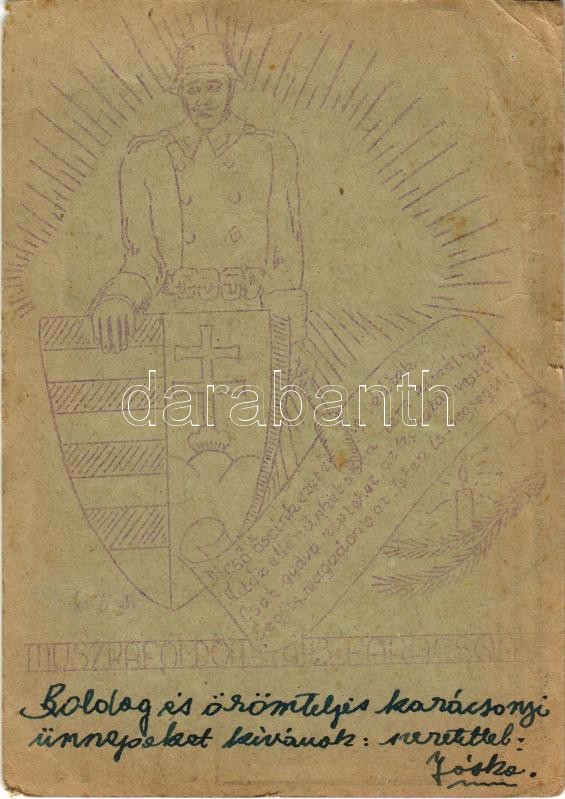1943 Karácsony Muszkaföldön. Magyarország kitartása és áldozatkészsége teszi győzelmessé fegyvereinket. Tábori Postai Levelezőlap saját kézzel rajzolt / WWII Hungarian military field post from Russia, Christmas hand-drawn greeting (szakadás / tear)
