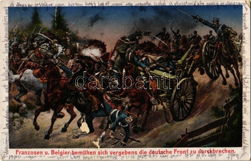 Franzosen u. Belgier bemühen sich vergebens die deutsche Front zu durchbrechen / WWI French and Belgian troops trying to break through the German front. M.M.S.W. III/2. (Rb)