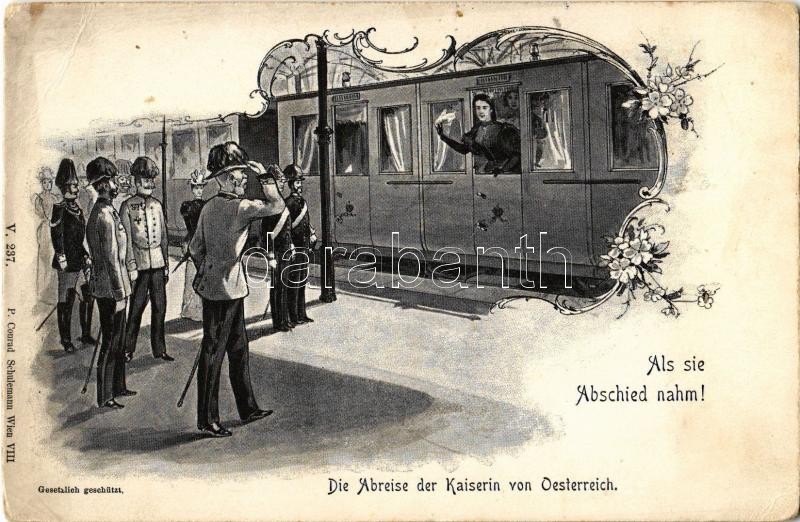 Als sie Abschied nahm! Die Abreise der Kaiserin von Oesterreich / Erzsébet magyar királyné (Sissi) búcsúja Ausztriából, Ferenc József / Empress Elisabeth of Austria (Sisi), Franz Joseph. P. Conrad Schulemann V. 237. Art Nouveau, floral (EB)